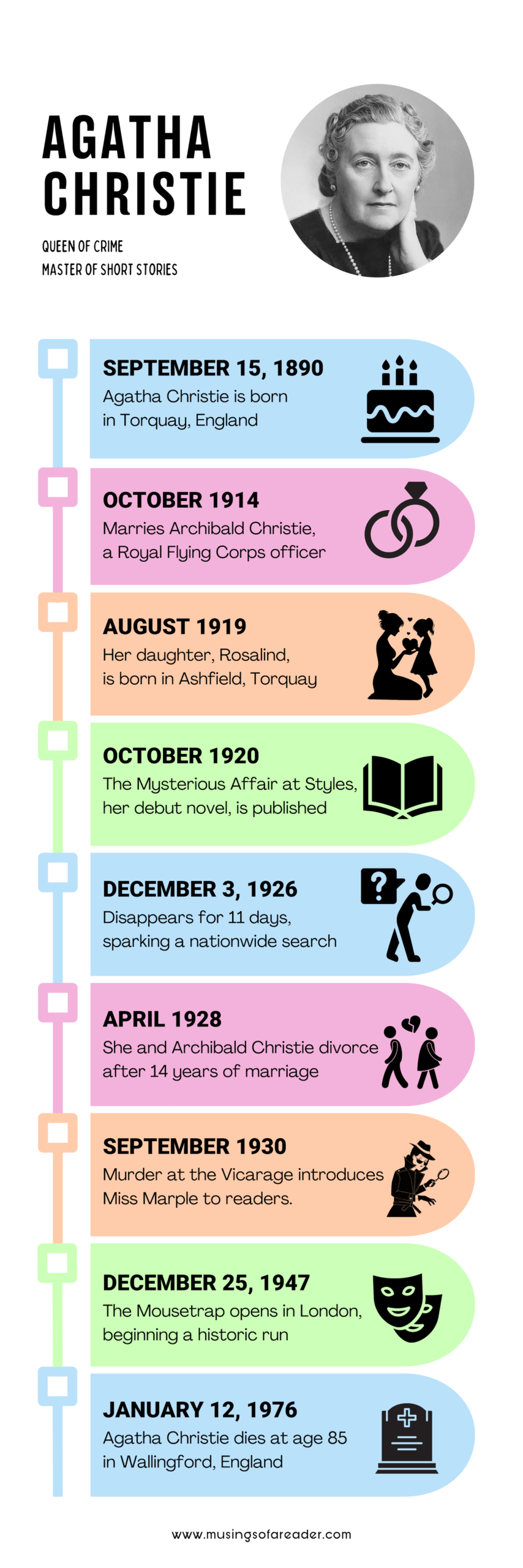 Discover the remarkable life of Agatha Christie through this timeline, highlighting key moments from her birth and early writing to global fame, iconic characters, and enduring legacy as the Queen of Crime.
