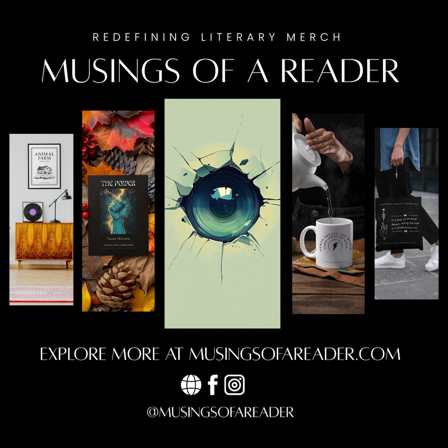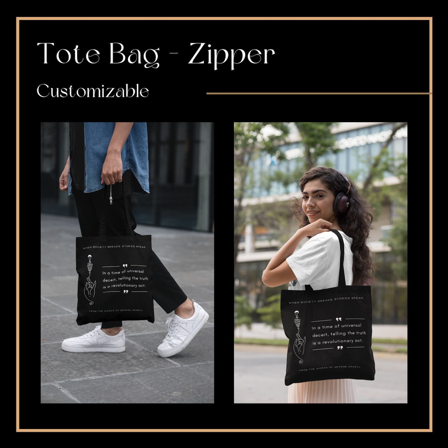 Tote Bag – This zippered tote is designed for readers who carry their ideas with them. Featuring a dystopian quote inspired by Orwell, it blends practicality with quiet rebellion. The sturdy fabric and secure closure make it ideal for daily use, while its message turns literature into a lived experience.