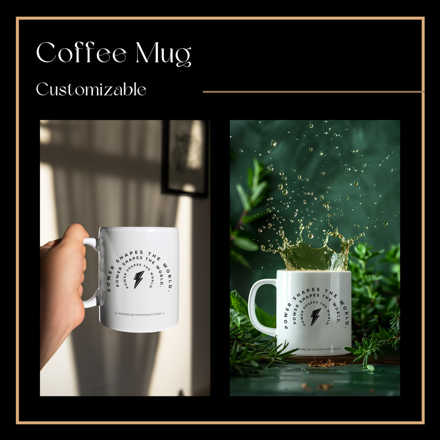 Coffee Mug (White) – This ceramic mug features the line “Power shapes the world,” turning a simple coffee break into a moment of reflection. Designed for everyday use, it reminds readers that power often works subtly, through routine and repetition. It is both functional and thought-provoking.