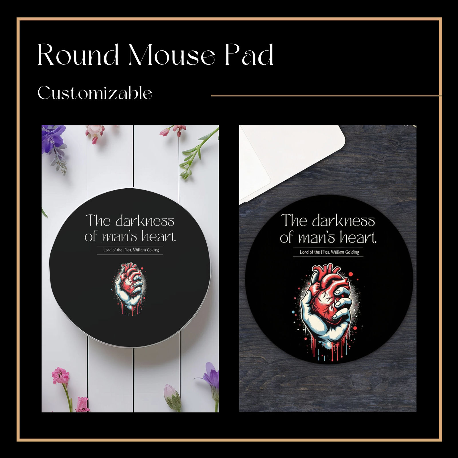 Round Mouse pad – This round mousepad is inspired by the themes of Lord of the Flies, reflecting the thin line between civilization and chaos. Designed for everyday workspaces, it pairs functionality with unsettling symbolism. It serves as a subtle reminder of how quickly order can unravel.