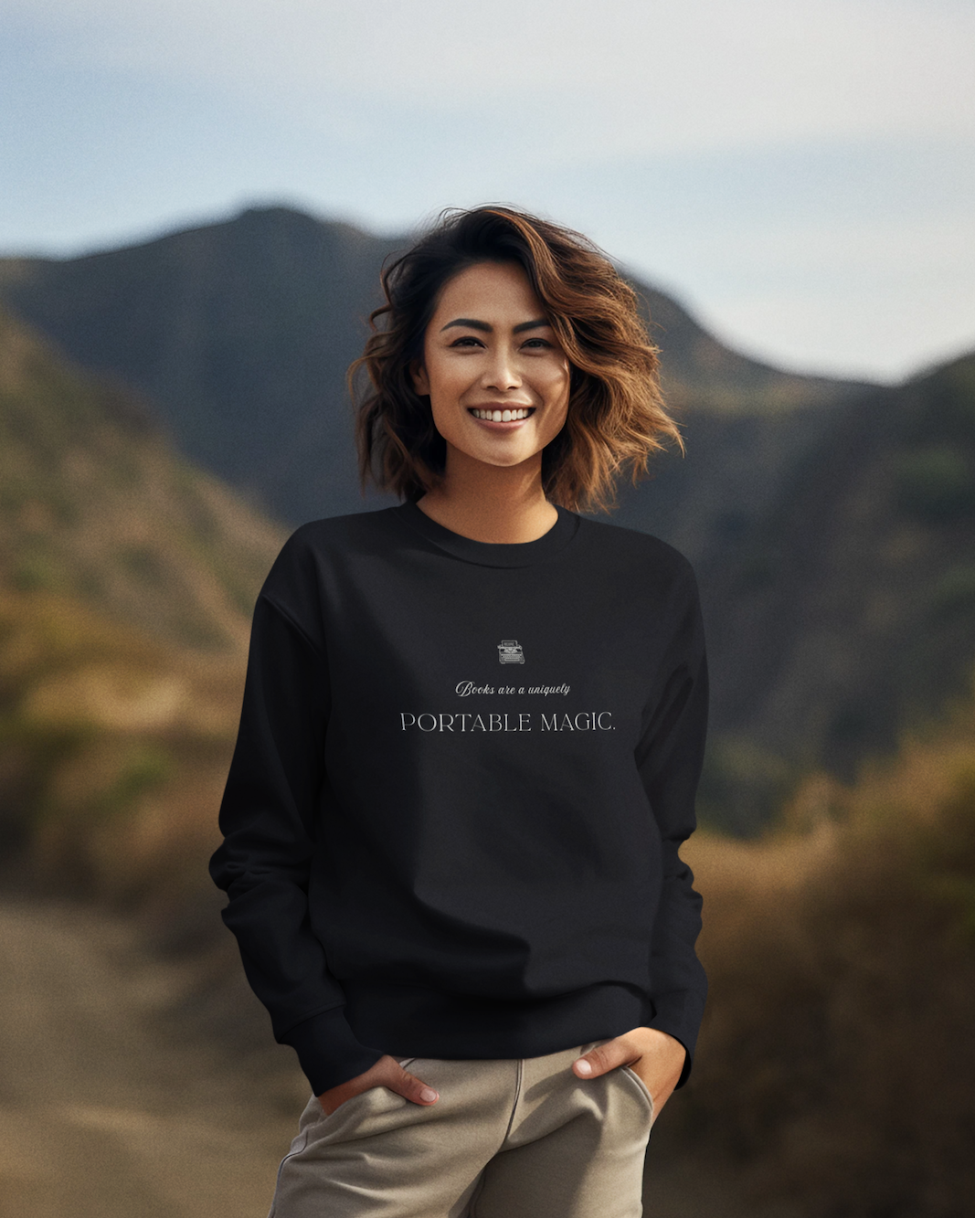 The Books are Portable Magic sweatshirt celebrates one of the most beloved truths about reading — that books carry entire worlds within their pages. Inspired by a famous quote by Stephen King, this design captures the quiet wonder every reader understands. A single book can transport us across continents, centuries, and imaginations. In this way, stories become a kind of magic we can carry anywhere.