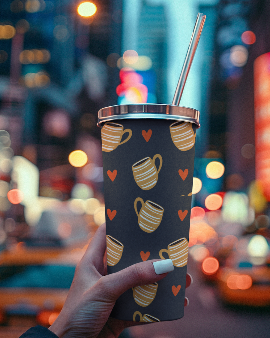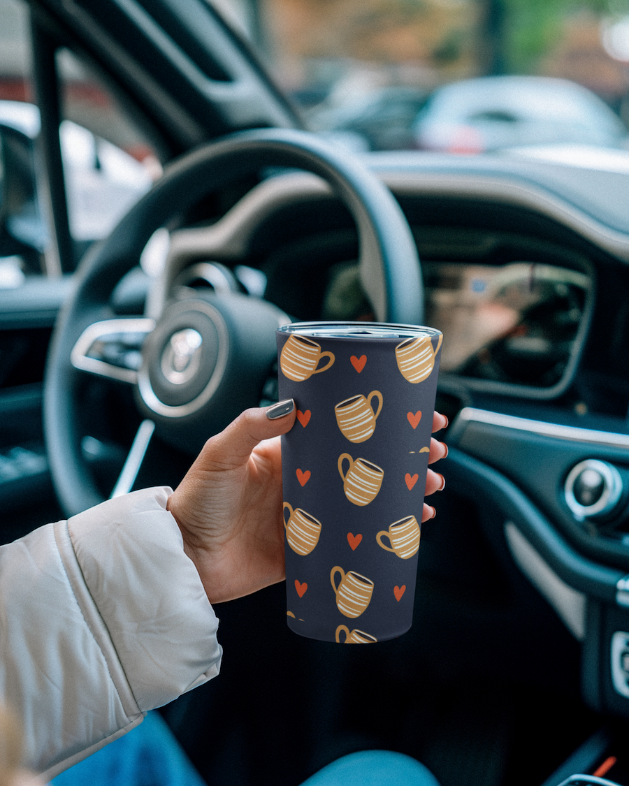 Bring your love for coffee and cozy moments into every part of your day with this charming coffee-themed tumbler. Designed for those who find comfort in warm cups and quiet pauses, this tumbler is more than just drinkware—it’s a small celebration of your daily ritual. The playful coffee mug pattern, paired with subtle heart details, captures the joy of those little moments that make your day feel complete.