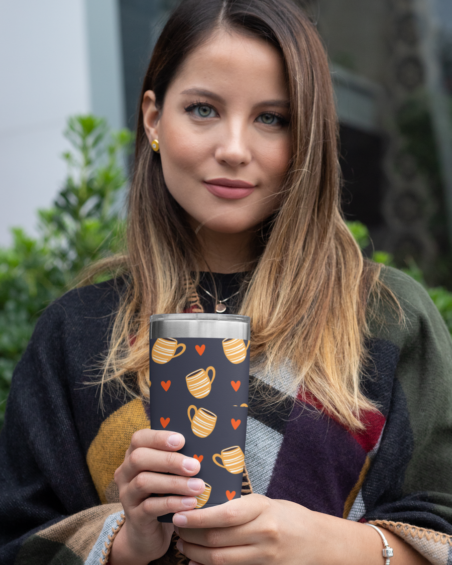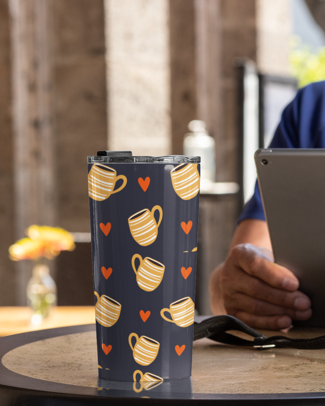 Carry your love for cozy coffee moments wherever you go with this coffee mug-themed tumbler. Designed for those who find comfort in every sip, it blends a warm, inviting aesthetic with a playful pattern of illustrated coffee cups and subtle heart accents. The charming design captures the essence of slow mornings, café vibes, and the simple joy of a perfect brew.