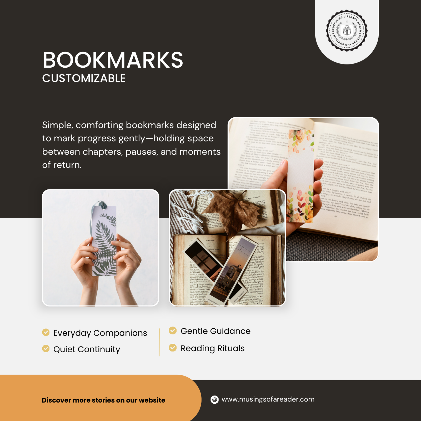 Bookmarks & Stickers – The bookmarks are simple, practical companions for everyday reading. Designed to rest gently between pages, they help readers pause without losing their place. Their understated design keeps attention on the story, supporting slow, intentional reading and the comforting rhythm of returning to familiar books.