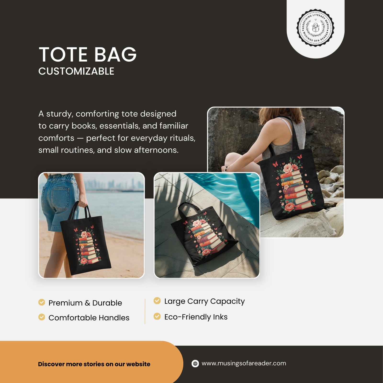 Tote Bag – The tote bag is designed for everyday use, offering durability and simplicity. It comfortably carries books, journals, and daily essentials. Its understated design reflects a literary sensibility rather than trend-driven aesthetics. As a result, it extends the experience of the Comfort Classics Book Box into everyday routines, accompanying errands, library visits, and moments shaped by reading.