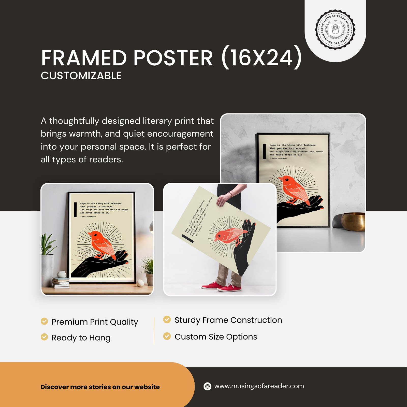 Framed Poster (16 × 24) – The framed poster adds a subtle visual element inspired by literature and stillness. Its size allows it to fit naturally into reading corners, bedrooms, or workspaces. Rather than serving as decoration alone, it acts as a quiet reminder of the role stories play in daily life. It complements the box’s emphasis on familiarity and intention, adding presence without excess.