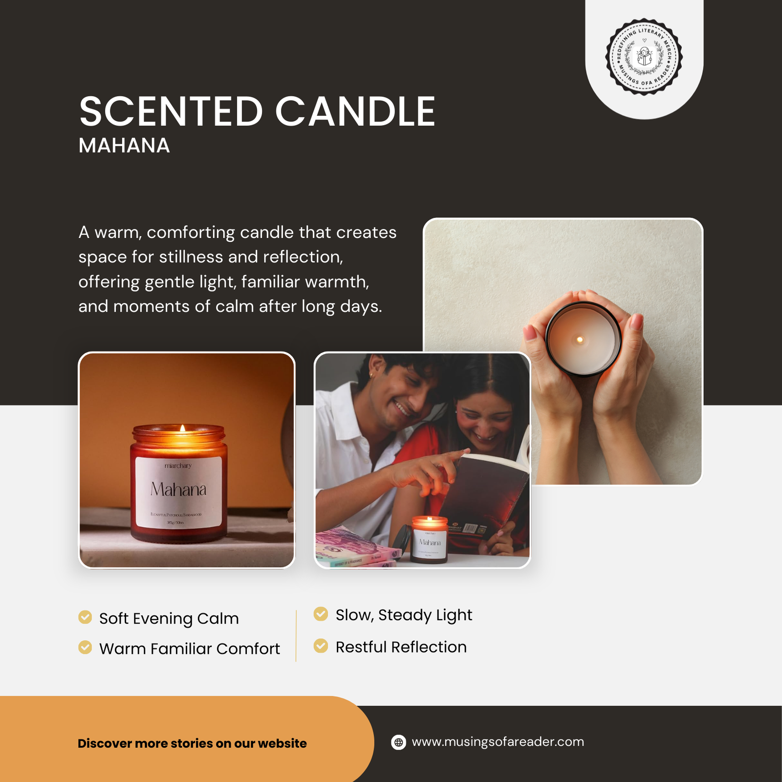 Mahana Scented Candle – The Mahana Scented Candle is designed to create a calm, inviting atmosphere for reading and reflection. Its gentle fragrance fills a space without overwhelming the senses. As a result, it supports long reading sessions, journaling, or quiet evenings. Lighting the candle becomes a small ritual—one that signals rest and presence. It pairs naturally with the mood of comfort classics, encouraging readers to slow down and remain with a story rather than rush through it.