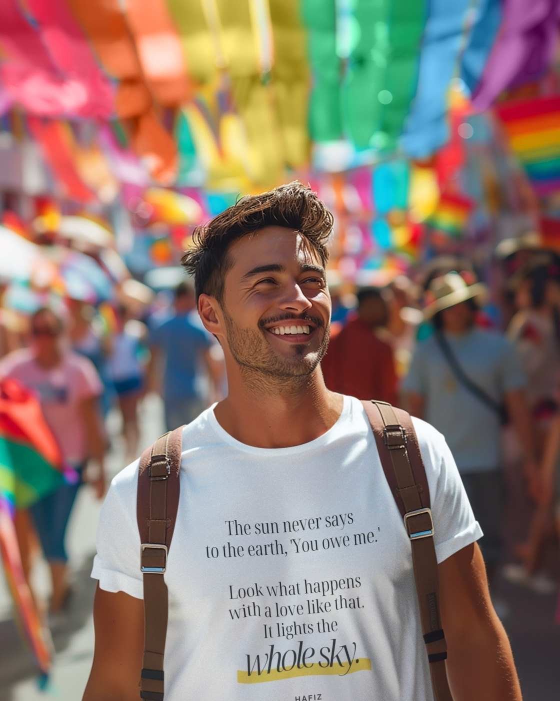 Inspired by Hafiz’s timeless words, this poetic tee is a reminder that true love gives without expectation. The line, “Even after all this time, the sun never says to the Earth, ‘You owe me,’” speaks to generosity, devotion, and a love so selfless it lights the whole sky.