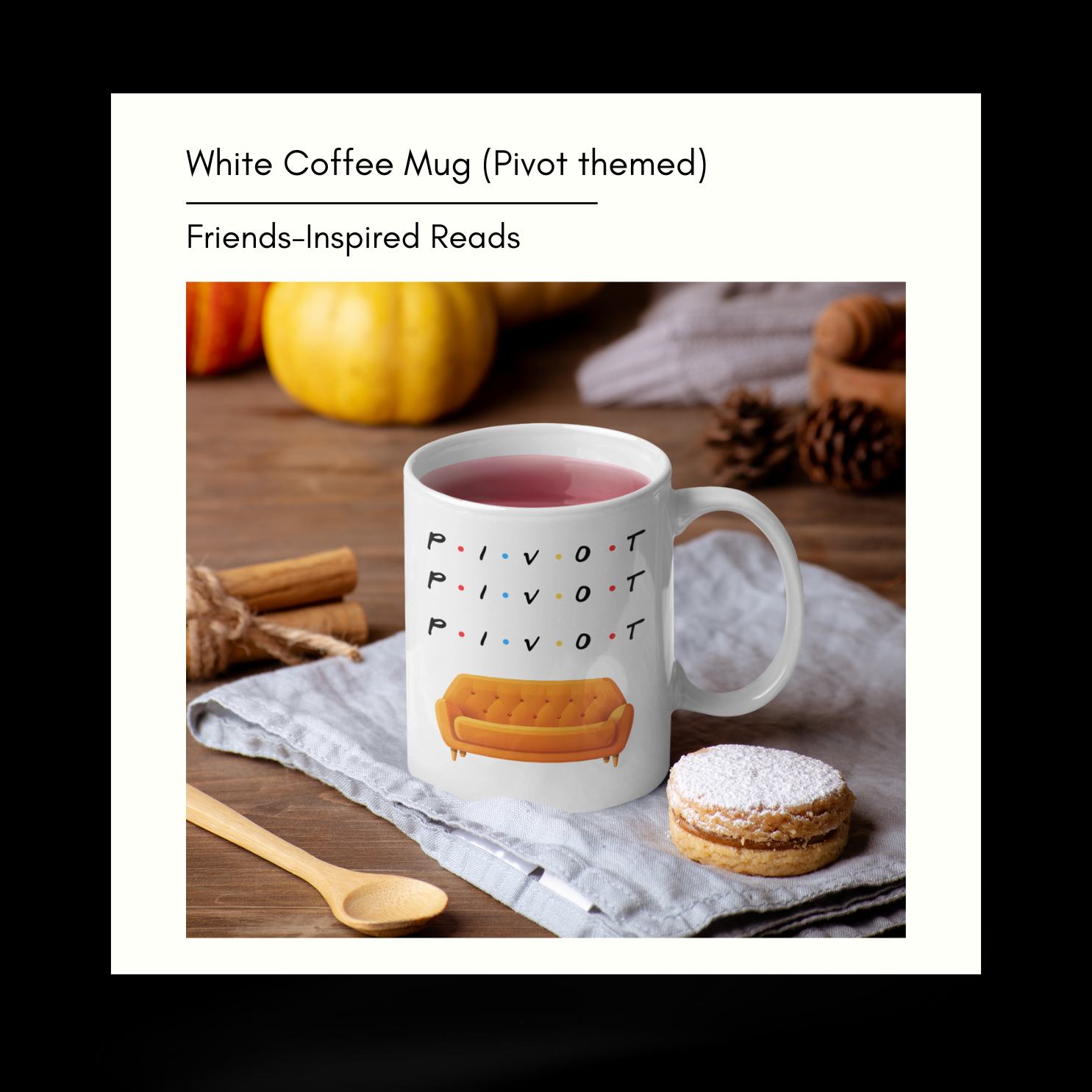 White Coffee Mug (Pivot-Themed) –A playful yet comforting nod to Friends, perfect for daily rituals — morning coffee, evening tea, or long conversations. Familiar, functional, and quietly nostalgic. Thoughtfully made to spark smiles and recognition, it turns ordinary pauses into moments of connection, reminding readers that comfort often lives in repetition, humour, and shared cultural memories.