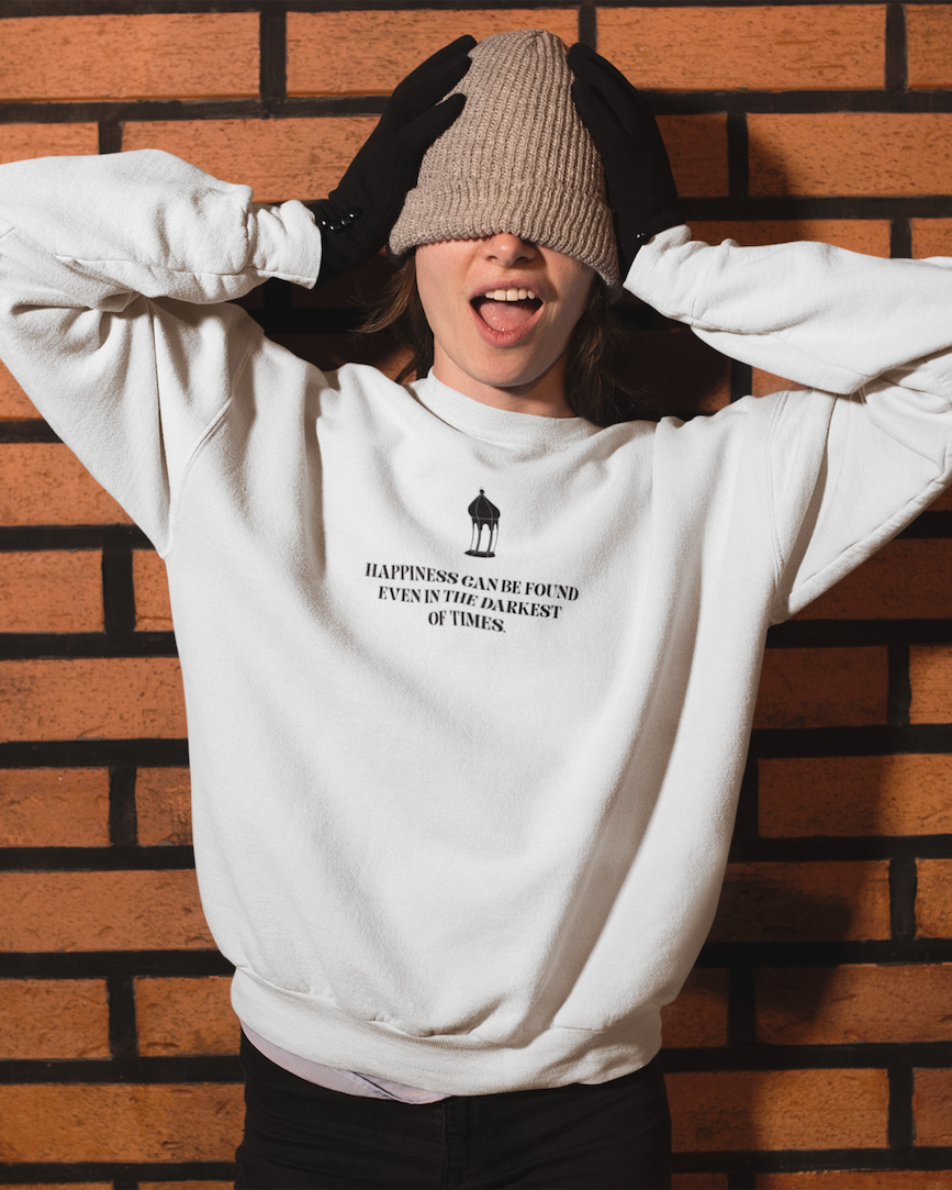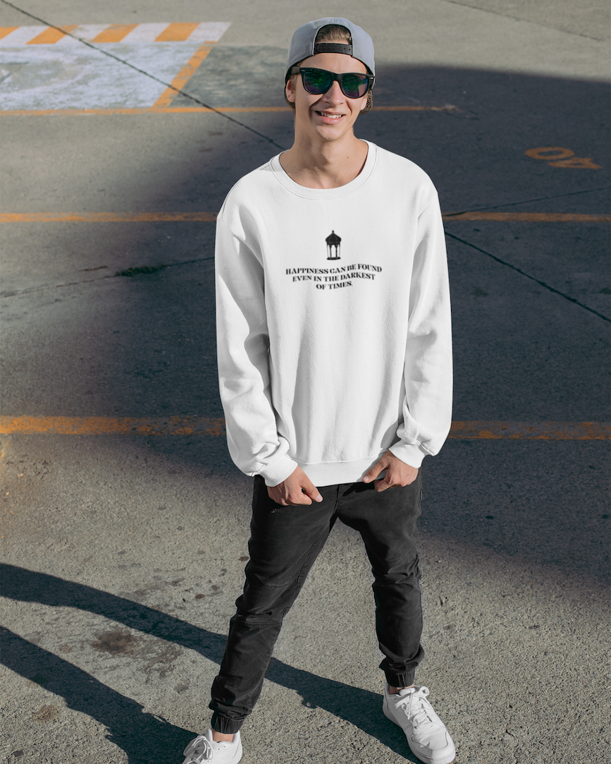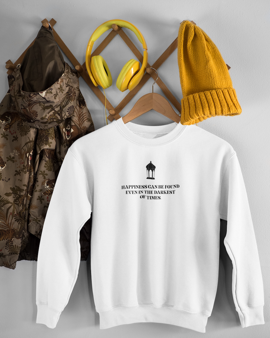 Inspired by the powerful words of Albus Dumbledore from the Harry Potter series, the Happiness Can Be Found Even in the Darkest of Times sweatshirt celebrates one of the most uplifting messages in modern fantasy.