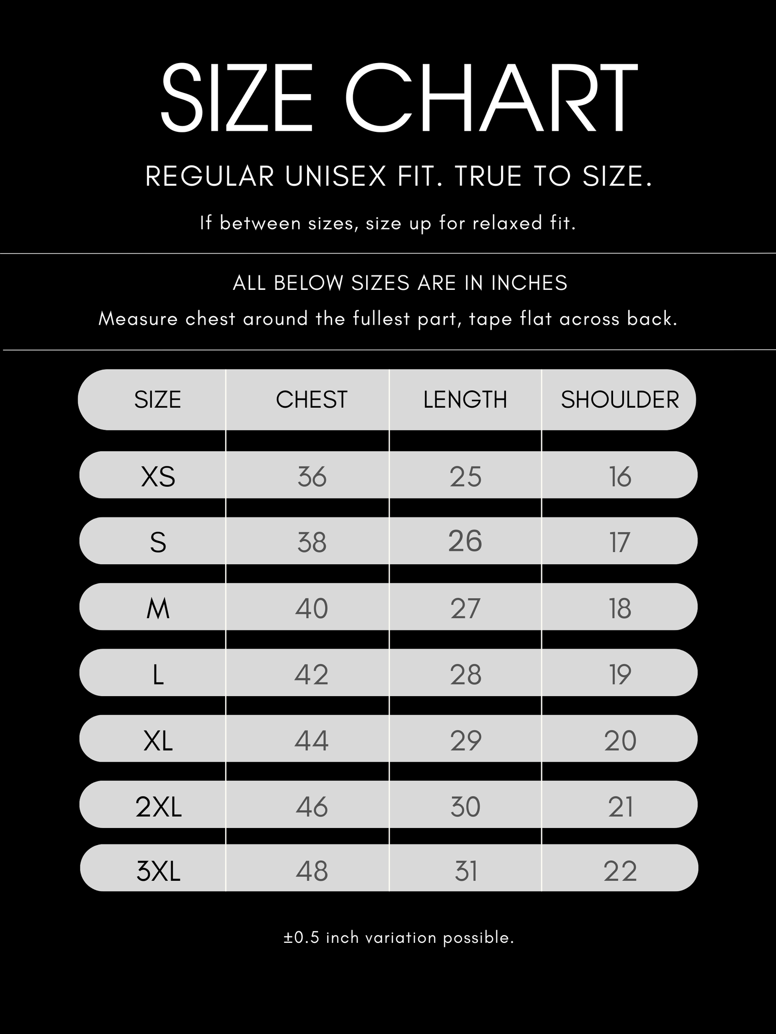 Standard Sizing: We follow U.S. and EU standards, and our sizes do not vary by more than +/- 0.5 inches. Furthermore, this T-shirt comes in a regular unisex fit and runs true to size. For a slightly relaxed or oversized look, consider sizing up. Please refer to the size chart before placing your order to ensure the best fit.