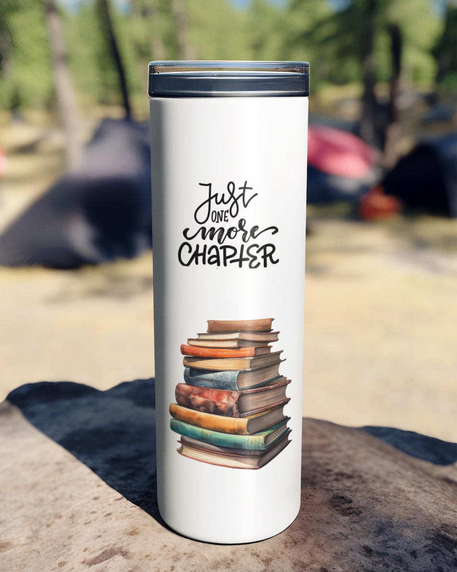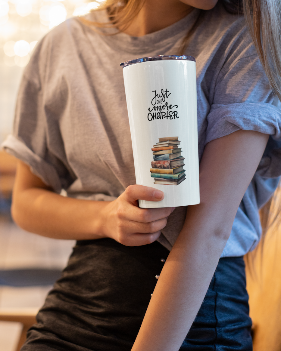 Carry your love for books into every moment of your day with this beautifully designed “Just One More Chapter” tumbler. Inspired by the irresistible pull of a good story, this tumbler captures the feeling every reader knows—when one chapter is never enough. The charming stacked-books design paired with the relatable quote adds a cozy, bookish touch to your everyday routine. Whether you’re starting your morning with coffee, pausing for a mid-day tea, or getting lost in a late-night read, this tumbler becomes your perfect companion. It’s more than just drinkware—it’s a reflection of your love for stories, imagination, and those “just one more chapter” moments.