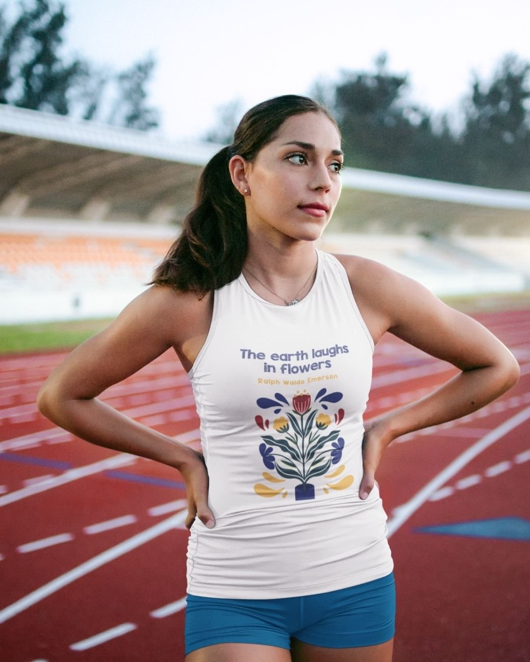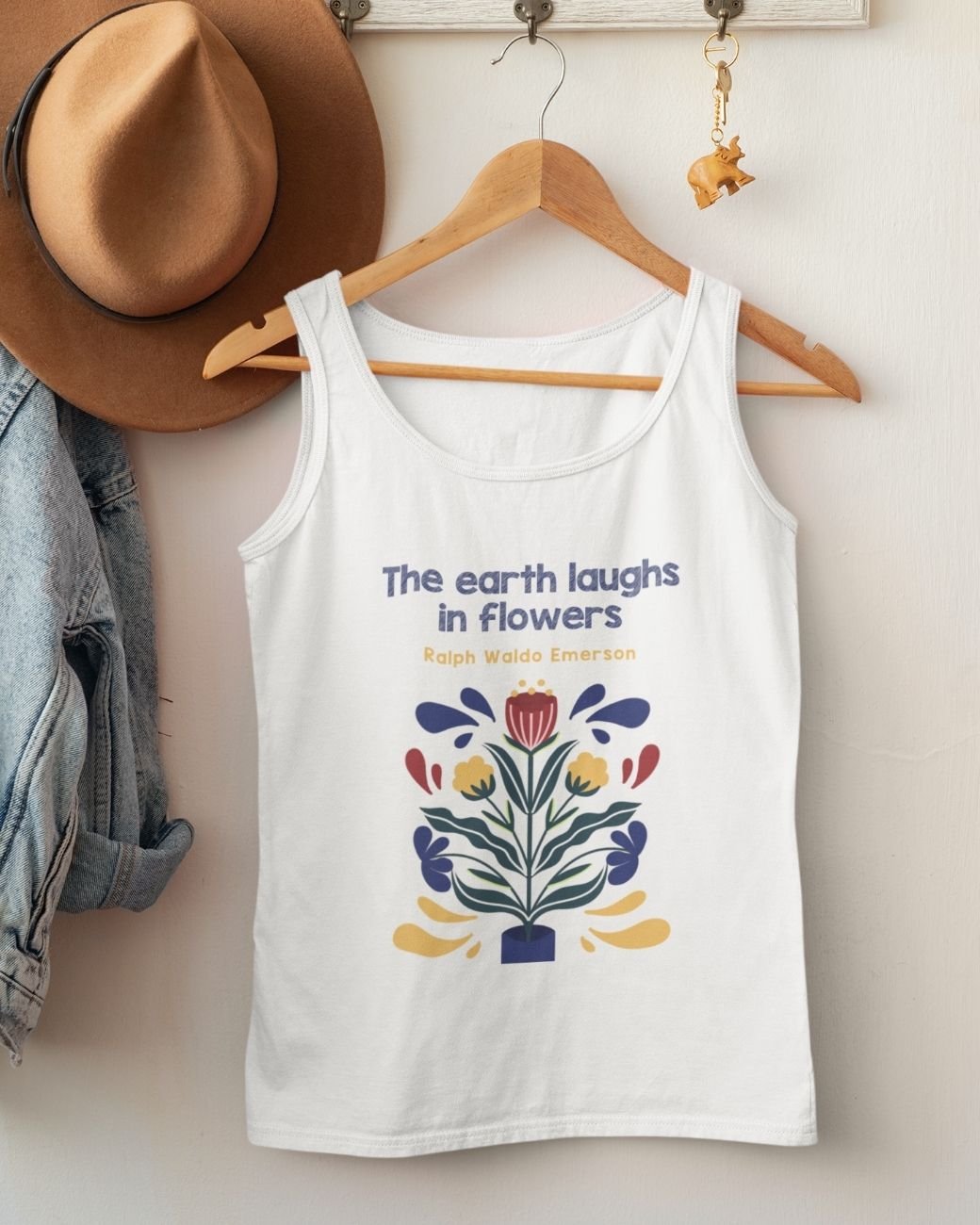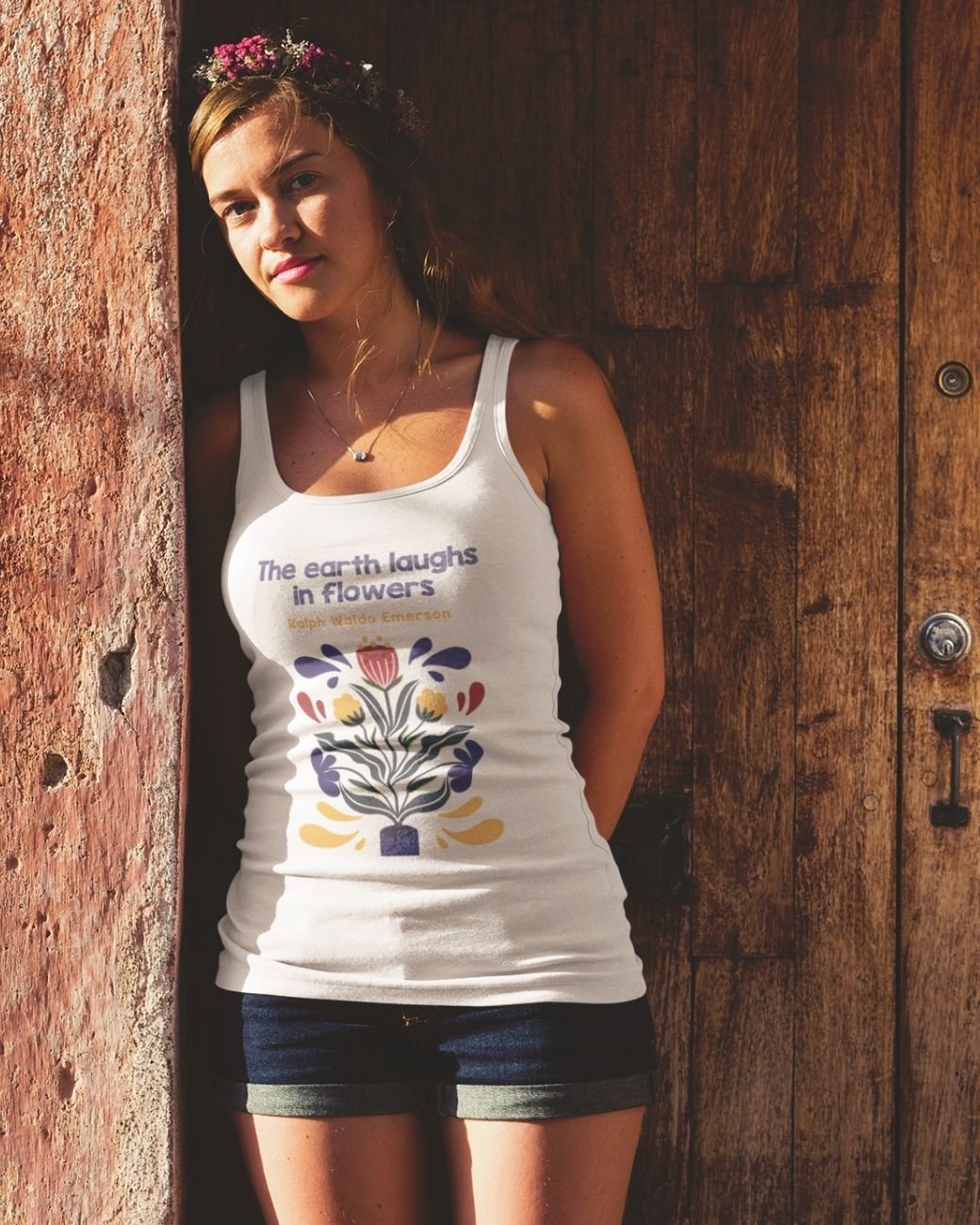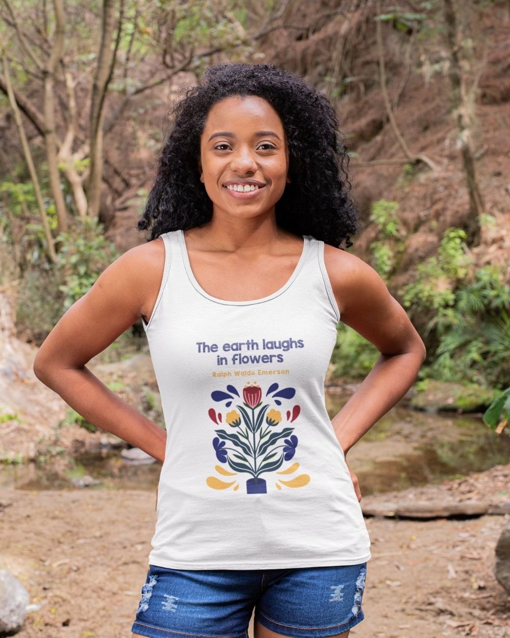 The tank top with the text, “The Earth Laughs In Flowers” is breezy and lightweight, perfect for warm weather. Its soft, breathable fabric drapes comfortably, offering a relaxed fit that flatters various body types. The tank’s primary color is a crisp, clean white, creating a perfect backdrop for the vibrant design that adorns it.