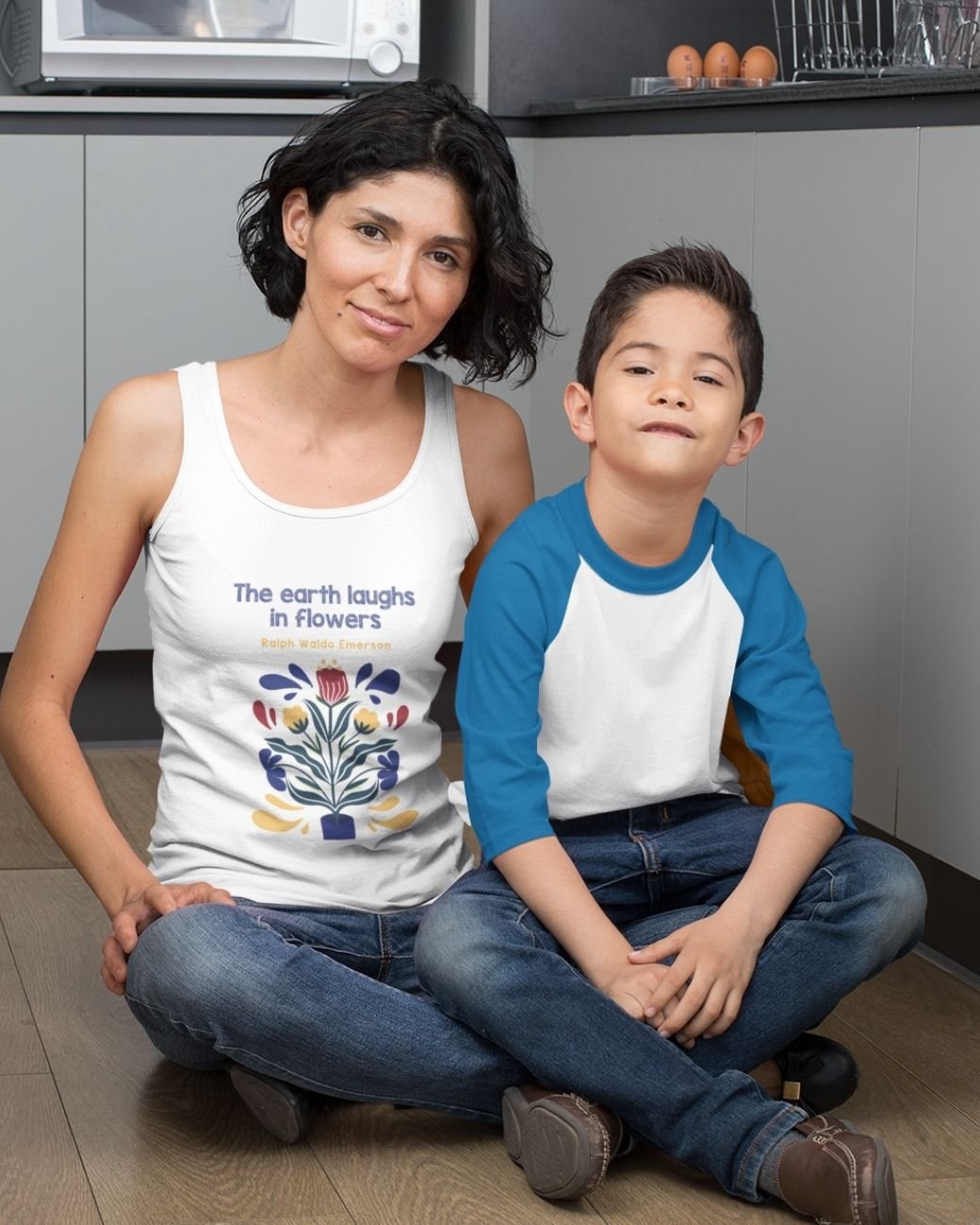 Across the chest in graceful, flowing script, Ralph Waldo Emerson’s quote is: “The earth laughs in flowers.” The typography is elegant and whimsical, inviting wearers and onlookers to pause and reflect on the profound simplicity of Emerson’s words. This poetic touch adds a layer of meaning and inspiration to the garment, making it more than just a piece of clothing.