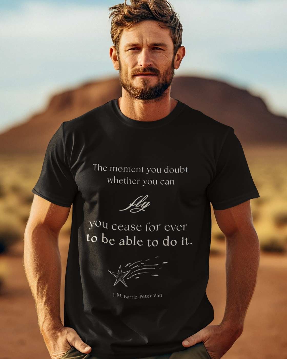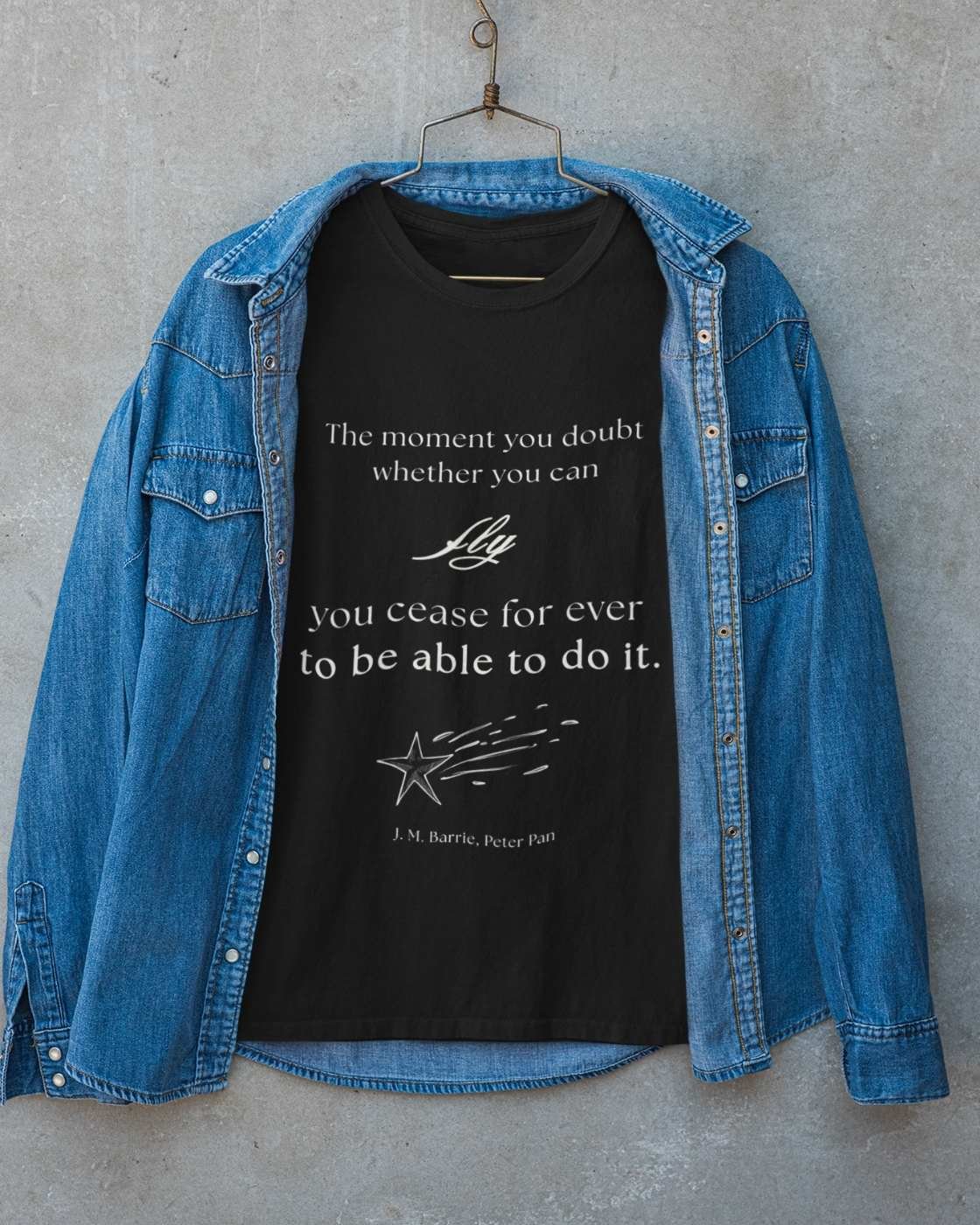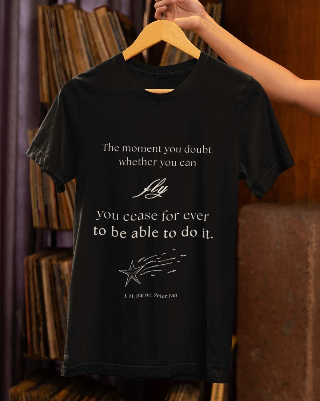 Wear your belief with our The Moment You Doubt Whether You Can Fly – J.M. Barrie T-shirt. Inspired by the timeless words from Peter Pan, this powerful tee is a reminder that courage begins with faith — especially faith in yourself.