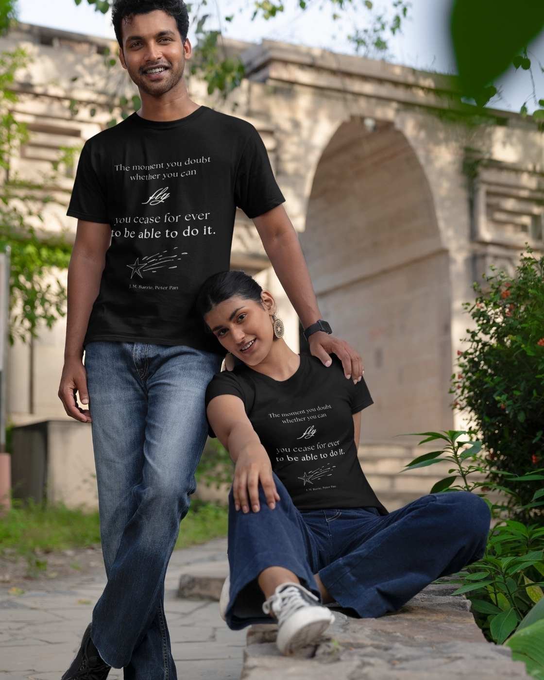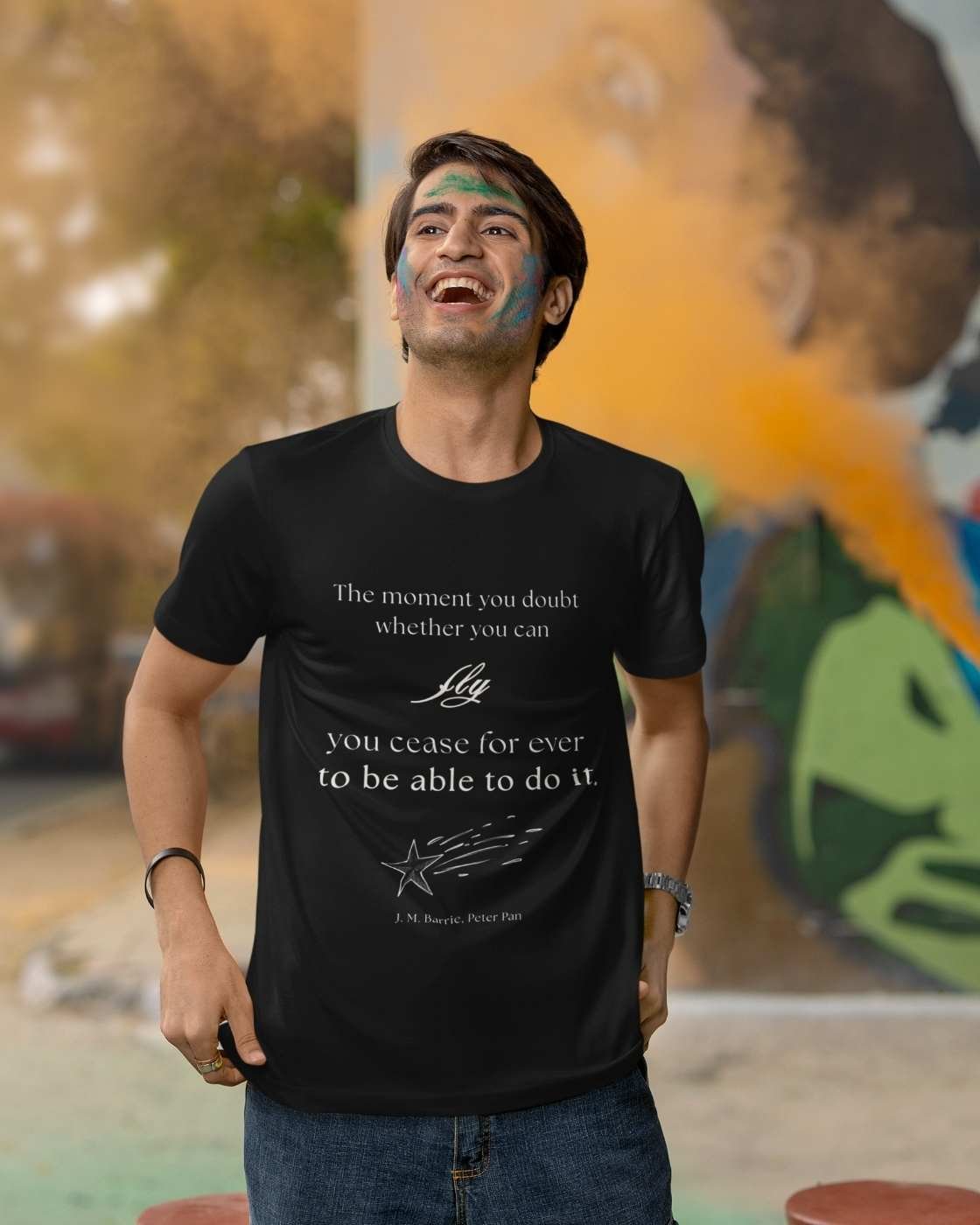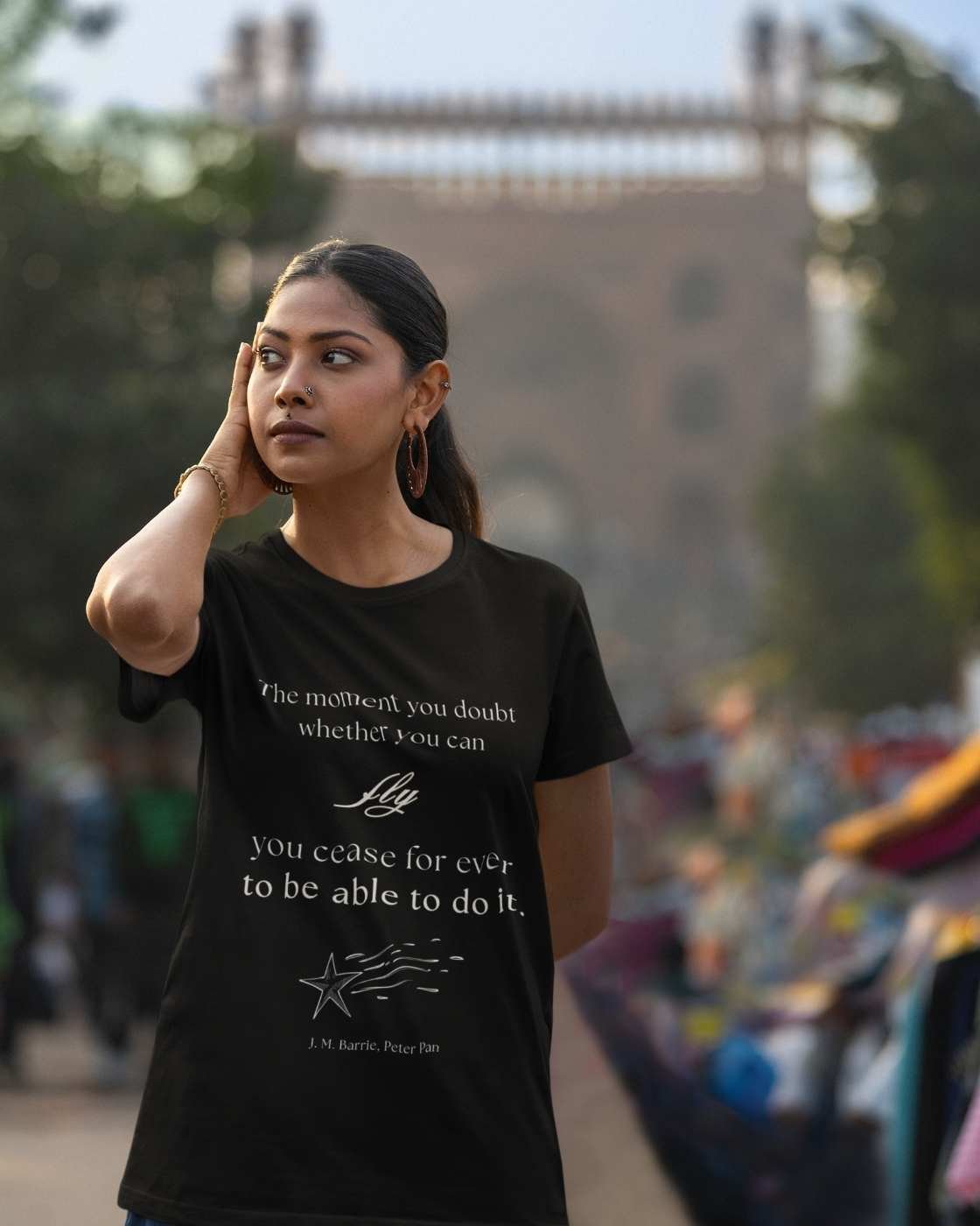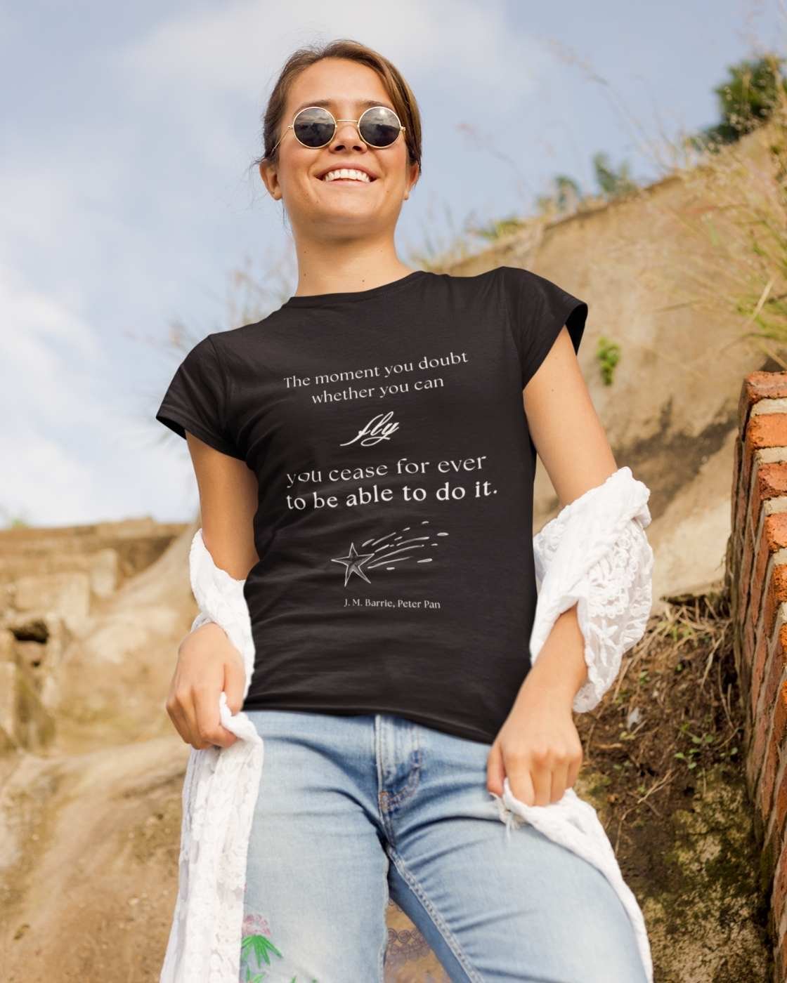 Wear your belief with our The Moment You Doubt Whether You Can Fly – J.M. Barrie T-shirt. Inspired by the timeless words from Peter Pan, this powerful tee is a reminder that courage begins with faith — especially faith in yourself.