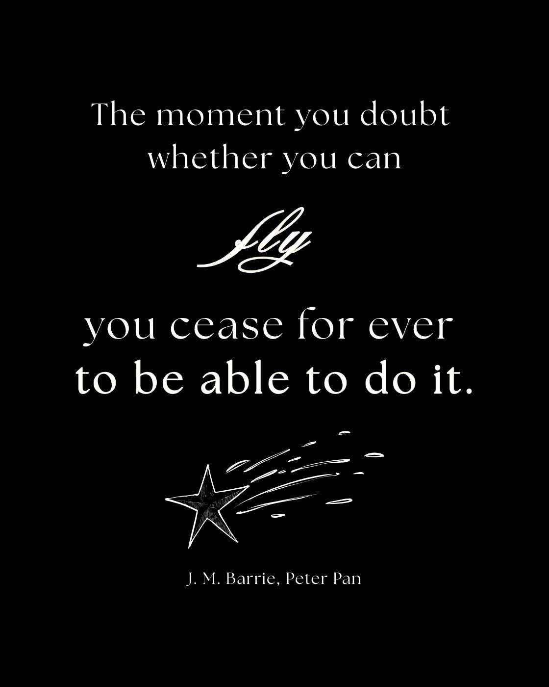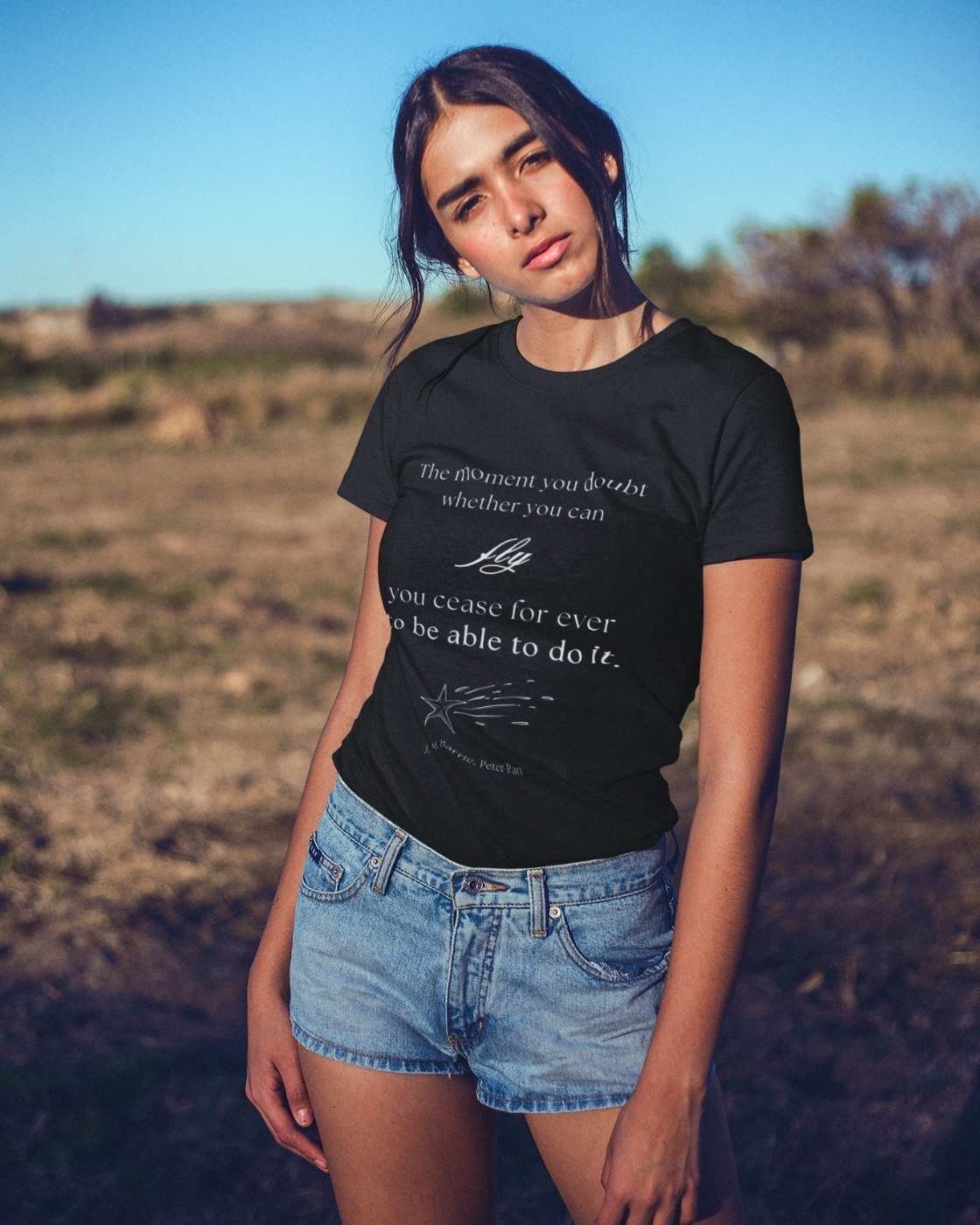 The The Moment You Doubt Whether You Can Fly T-shirt brings to life one of the most beloved lines from J.M. Barrie’s Peter Pan. Rooted in imagination and quiet courage, this design reminds us that belief marks the first step toward possibility.