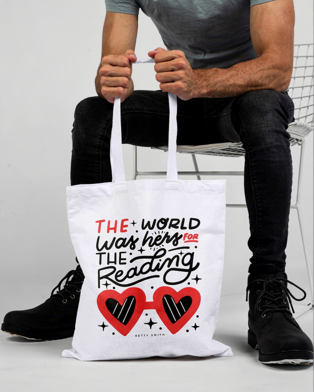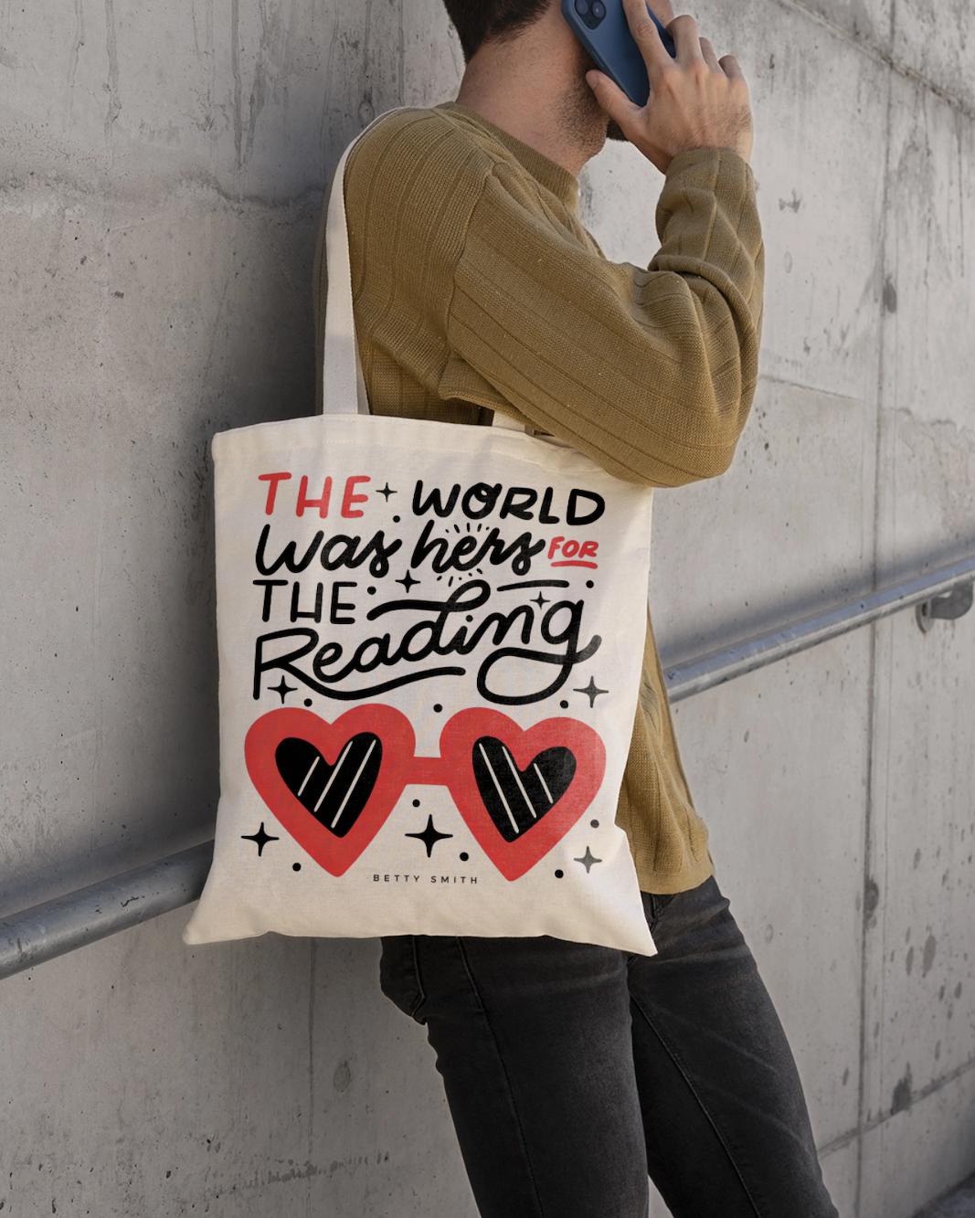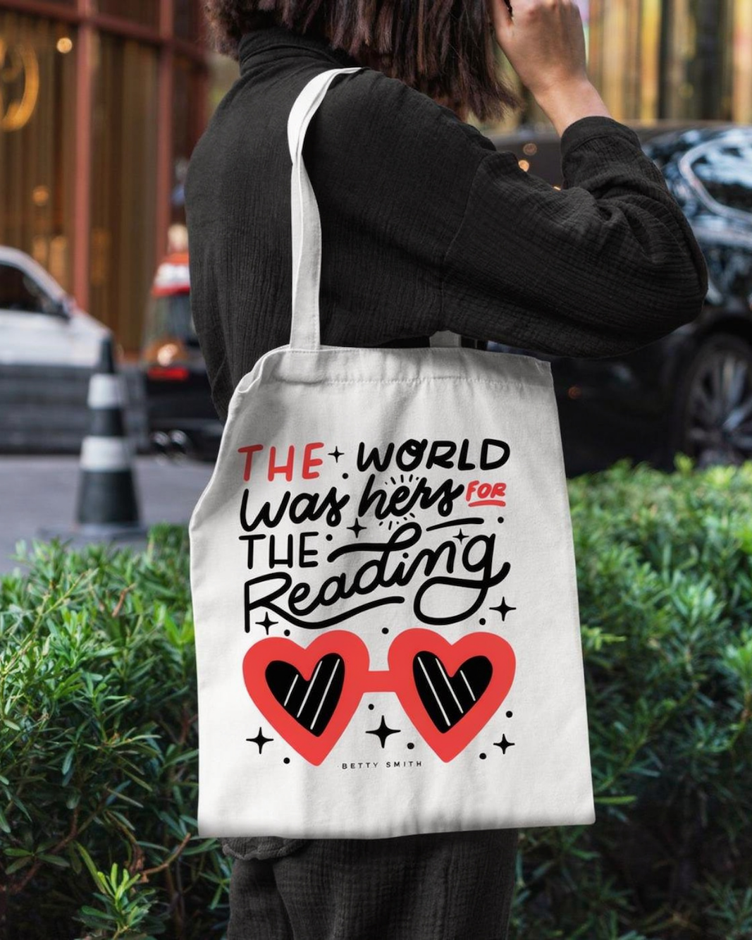 Designed for readers who believe the world opens through books, this “The World Was Hers for the Reading” tote bag blends bold typography with a playful, expressive design. It beautifully captures the joy, freedom, and empowerment that reading brings.