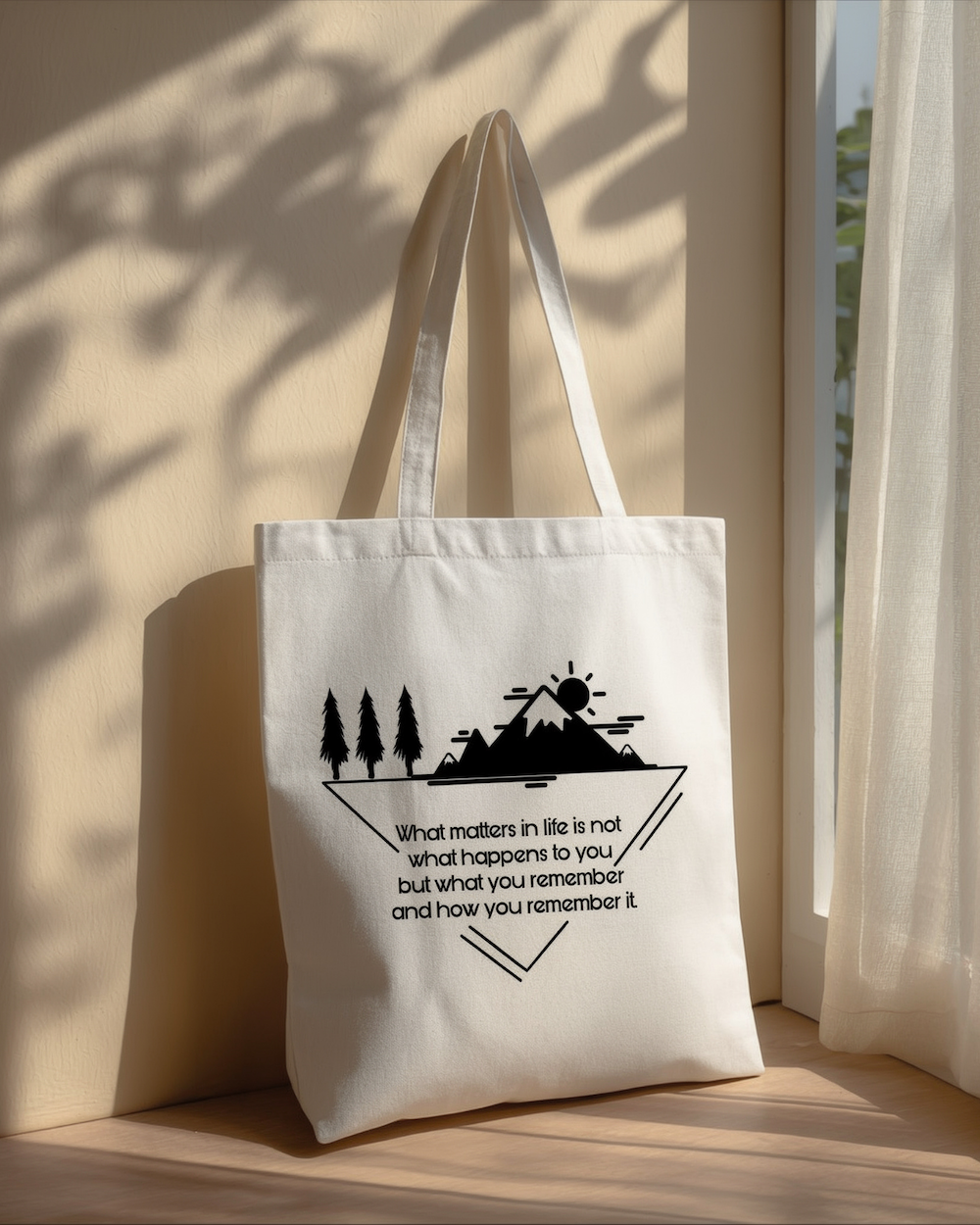 The design features a serene landscape illustration paired with clean, structured typography, creating a calm and reflective aesthetic. The minimal black artwork against a light canvas base gives it a timeless appeal, making it both elegant and meaningful. It’s more than just a tote—it’s a gentle reminder to find meaning in moments and memories. Spacious and practical, this tote is perfect for carrying your books, journals, or everyday essentials. Whether you’re heading to a quiet café, a bookstore, or simply stepping out for the day, it complements your routine with a sense of calm and purpose.