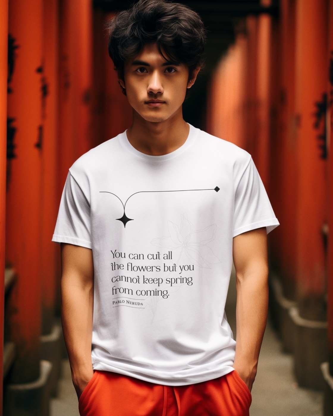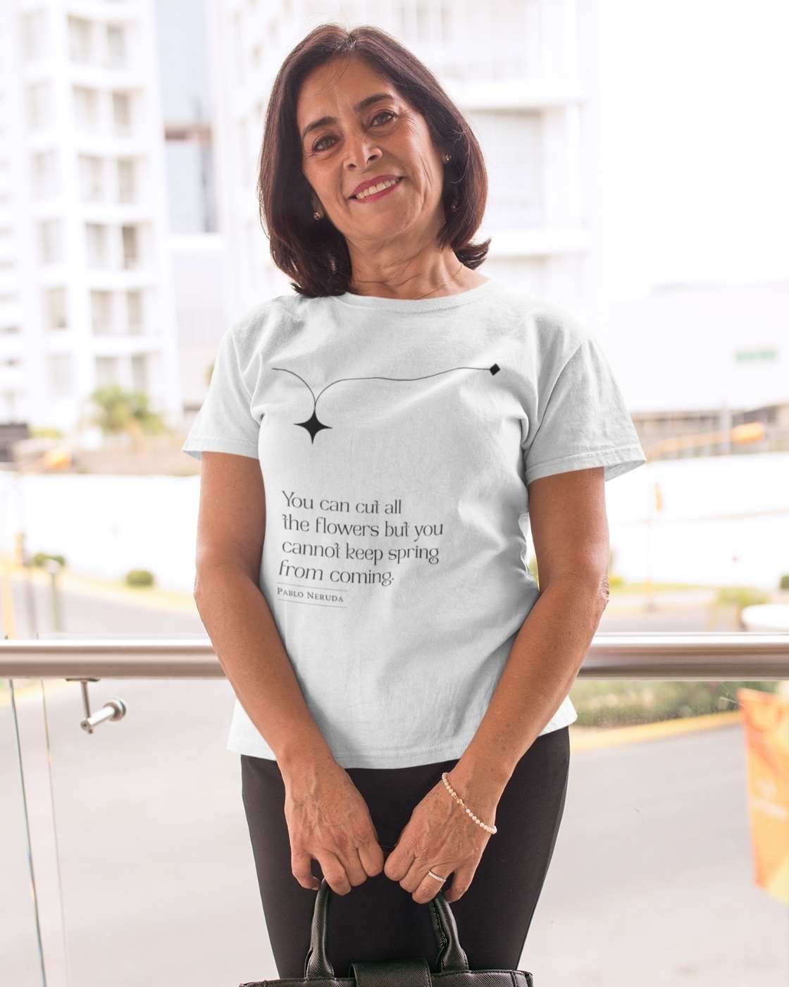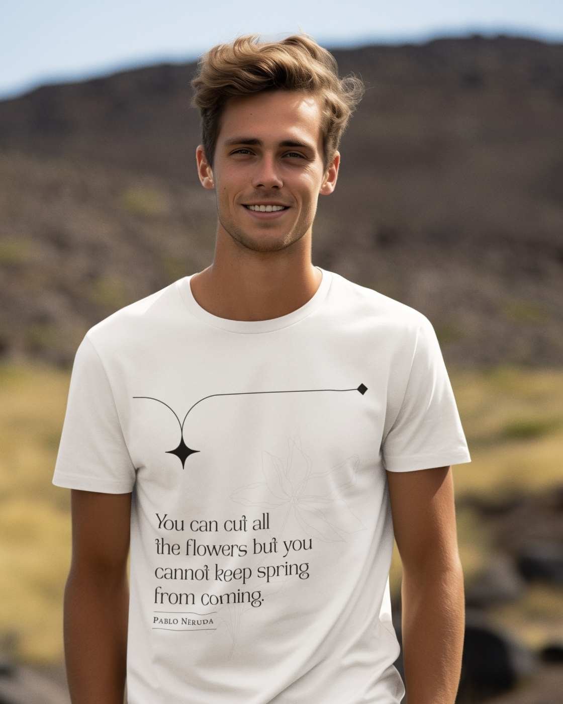 The You Can Cut All the Flowers but You Cannot Keep Spring from Coming T-shirt captures the quiet resilience that defines Neruda’s poetry. Through this powerful line, Neruda reminds us that hope survives every attempt to silence it. Even when loss feels overwhelming, renewal finds its way back, and life insists on returning.