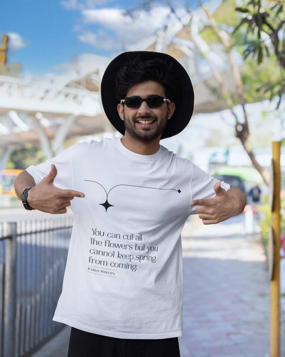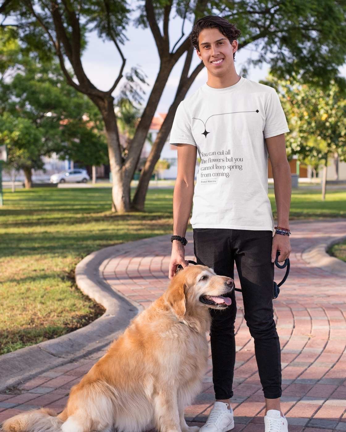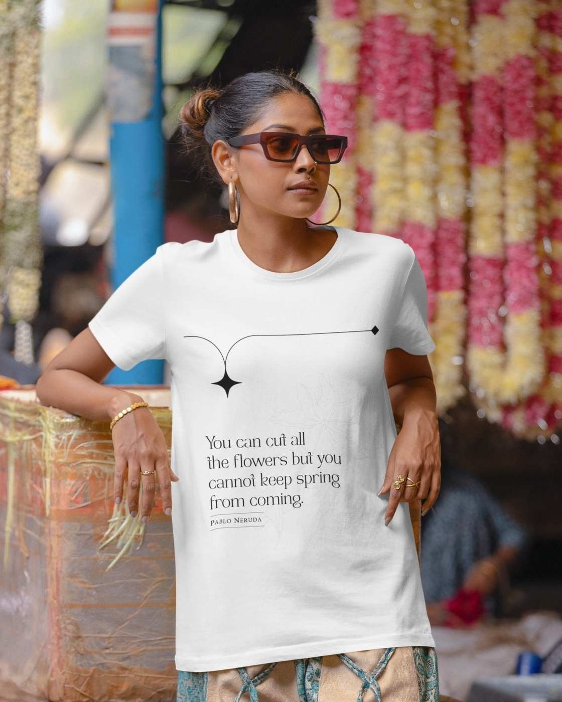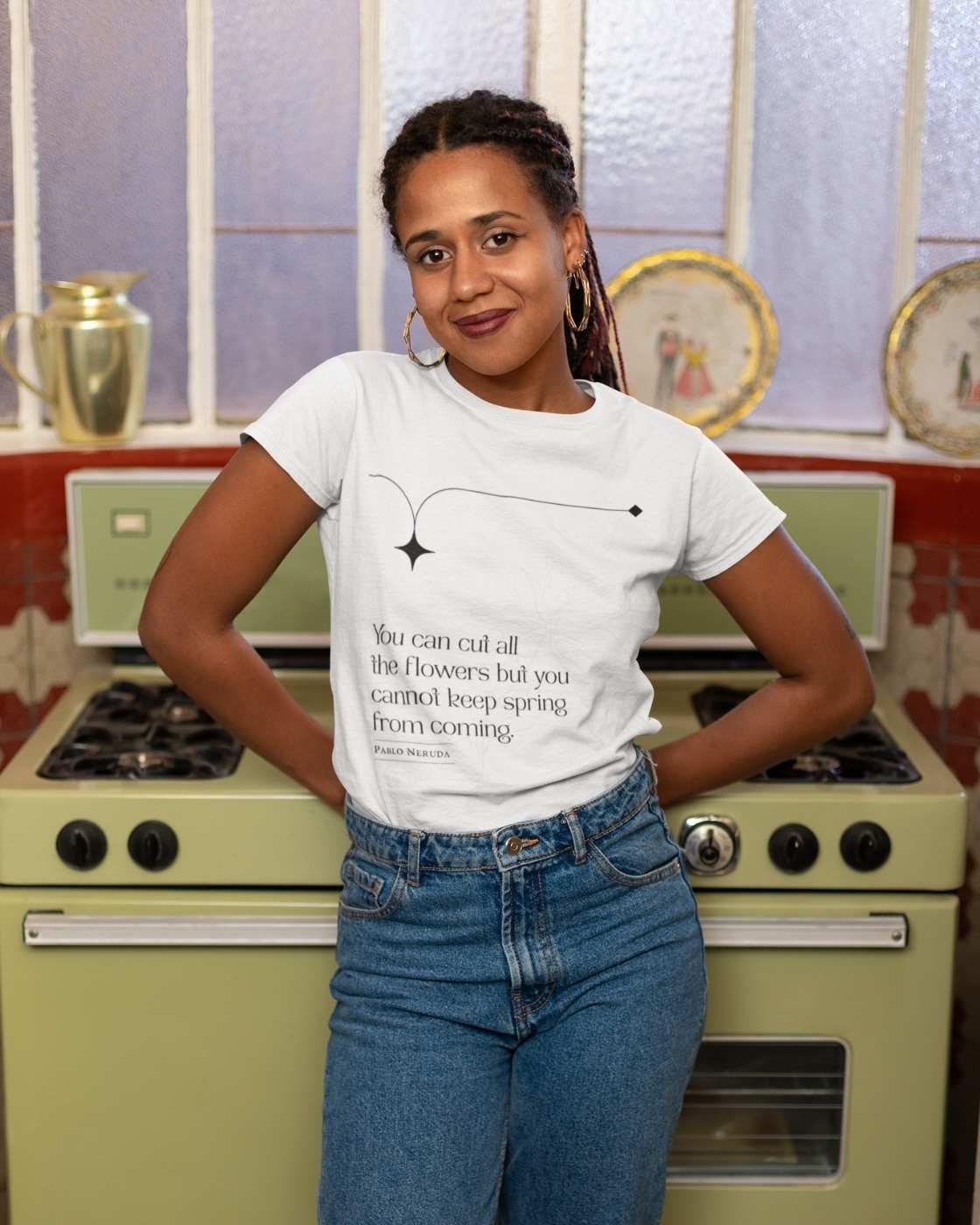 The You Can Cut All the Flowers but You Cannot Keep Spring from Coming T-shirt captures the quiet resilience that defines Neruda’s poetry. Through this powerful line, Neruda reminds us that hope survives every attempt to silence it. Even when loss feels overwhelming, renewal finds its way back, and life insists on returning.