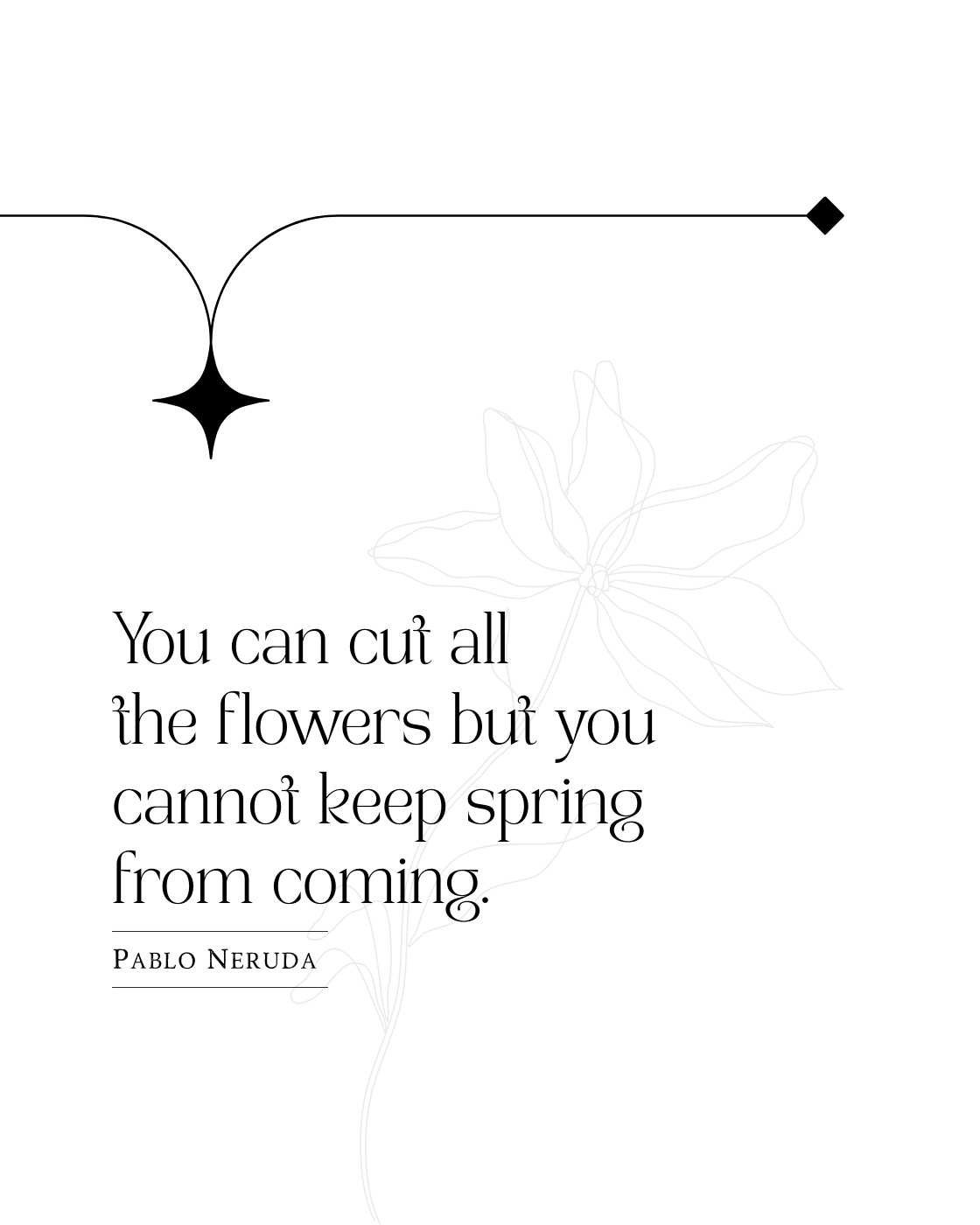 Inspired by Pablo Neruda’s enduring words, this powerful tee is a reminder that hope cannot be erased. The line, “You can cut all the flowers but you cannot keep Spring from coming,” speaks to resilience, renewal, and the quiet certainty that brighter days always return.