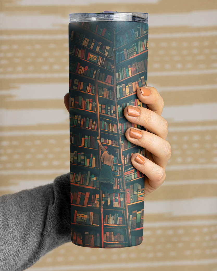 Inspired by towering bookshelves and quiet libraries, this Climbing Stories tumbler captures the wonder of discovering new worlds one book at a time. The design reflects the feeling of moving from one story to the next, like climbing through layers of imagination and endless possibilities.